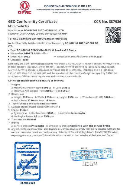 Norme:GCC Nombre:CCR No.387932 Prescription Date:2021-08-31 Portée / Range:Truck Délivré par:GSO |
